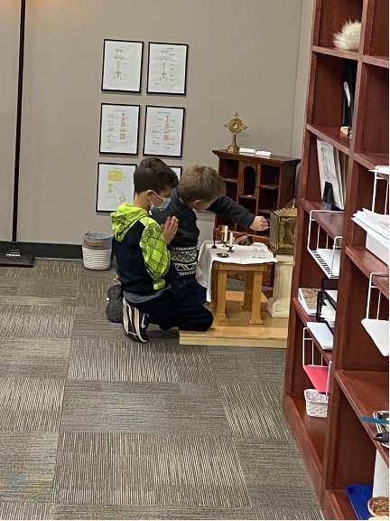 Catechesis of the Good Shepherd is a Montessori-based approach to the religious formation of children ages 3-12, based on the pillars of Scripture and Liturgy. Children gather in a carefully prepared environment, called the Atrium, where they and their adult catechist(s) can hear, ponder, and celebrate the mysteries of their Catholic faith. There, the children work with beautiful materials that invite them to enter more fully into the liturgical celebrations of the Church as well as meditating deeply into the Scriptures proclaimed. Much like a children’s Chapel, the Atrium nurtures the children’s life of prayer, contemplation, and their relationship with God.